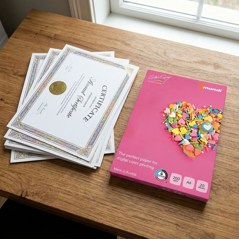 Độ dày 200gsm là tiêu chuẩn lý tưởng cho các loại bằng khen, chứng chỉ đào tạo. Nó mang lại vẻ trang trọng, bền bỉ theo thời gian và không bị nhăn hay thấm mực khi đóng dấu.
