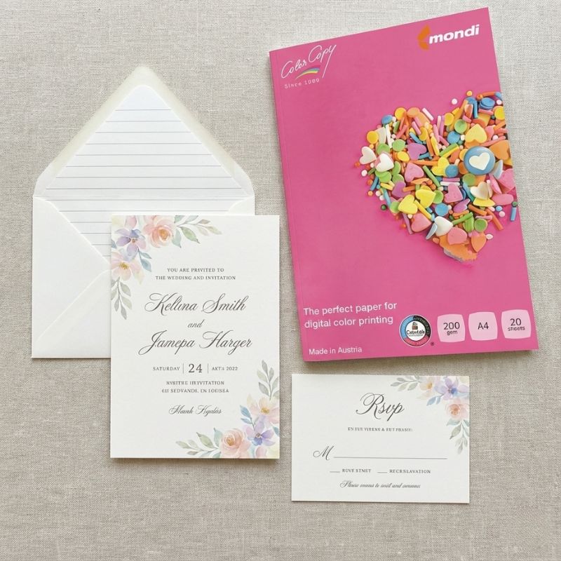 Với khả năng in được các họa tiết hoa văn tinh tế và chữ viết sắc nét, Mondi 200gsm cực kỳ được ưa chuộng để làm thiệp mời sự kiện, thiệp cưới hoặc thẻ RSVP. Độ trắng của giấy giúp làm nổi bật các tông màu pastel dịu nhẹ.